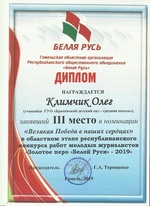 Учащийся ГУО «Бриневский детский сад - средняя школа» Климчик Олег Геннадьевич в номинации «Великая Победа в наших сердцах» был награжден дипломом III степени.